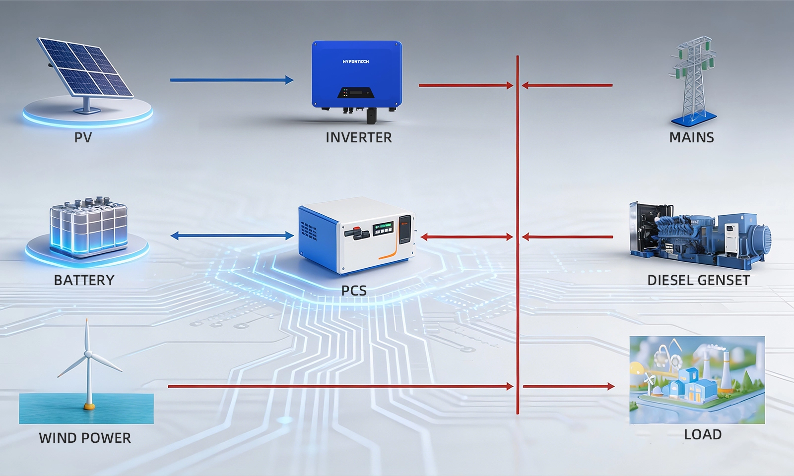 The intelligent hybrid power management system autonomously controls power distribution among generators, battery storage, PV, wind, and the main grid, optimizing the most economical power management combination for the entire system. It provides a user-friendly interface to select the ideal operating mode under any circumstances, ensuring safe, efficient, and reliable energy supply.