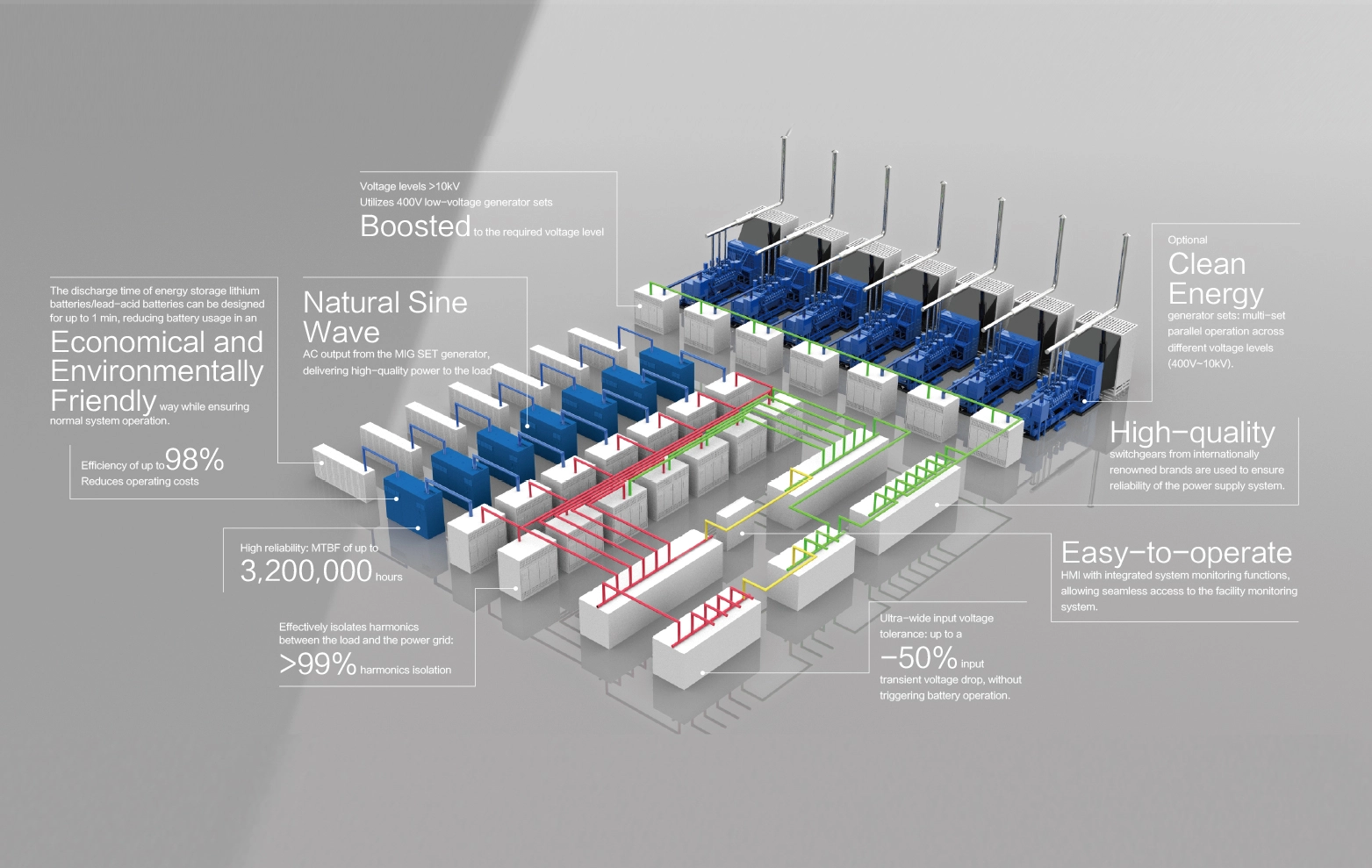 The main unit adopts a synchronous generator-based dynamic UPS, with a single-unit power ranging from 560 to 3600 kVA.